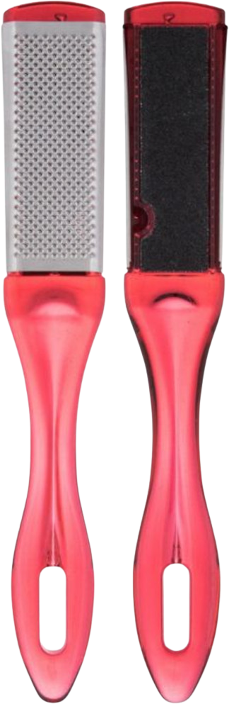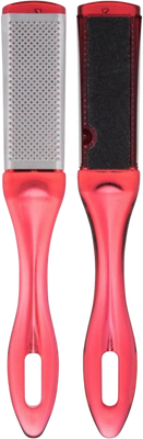 Obojstranná škrabka na päty. Kovová časť na odstránenie veľmi tvrdej kože na pätách, druhá strana s klasickým pilníkom na zjemnenie a vyhladenie.