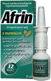 Afrin sa používa na zmiernenie príznakov upchatého nosa spôsobených sennou nádchou, bežným prechladnutím a zápalom prinosových dutín. Môže sa používať každých 12 hodín. Liečivo je oxymetazolíniumchlorid. Afrin® 0,5 mg/ml nosový sprej s mentolom je voľnopredajný liek s liečivom oxymetazolíniumchlorid určený na aplikáciu do nosa. Viac informácií