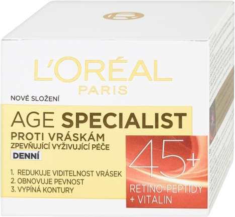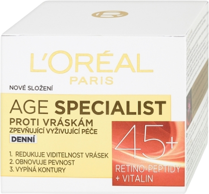 L'Oréal Paris Age Specialist 45+ Denný krém 50 mlVšetko o produkteDoplňujúce informácieHodnotenie produktuV každom veku má pleť iné potreby. Krémy Age Specialist sú šité na mieru danému veku. Po 45. roku života dochádza k spomaľovaniu bunkovej regenerácie. Postupne sa objavujú viditeľné vrásky. Pokožka stráca svoju pevnosť a kontúry sú menej zreteľné. Denný krém L’Oréal Paris Age Specialist 45+ pomáha bojovať proti prejavom starnutia pleti. Krém pokožku počas dňa intenzívne hydratuje a výsledkom je viditeľne pevnejšia a hodvábne hladká pleť. Denný krém Age Specialist 45+ je vhodný pre ženy nad 45 rokov.