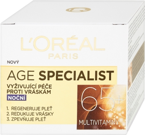 L'Oréal Paris Age Specialist 65+ Nočný krém 50 mlVšetko o produkteDoplňujúce informácieHodnotenie produktuAko pleť starne, zvyšuje sa jej potreba protivráskovej starostlivosti. Po 65. roku života, stráca pleť základné živiny, čo vedie k oslabeniu prirodzenej ochrannej bariéry. Pokožka stráca pevnosť a začnú sa objavovať pigmentové škvrny. Vyživujúca starostlivosť Age Specialist 65+ od L'Oréal Paris sa zameriava na špecifické potreby zrelej pleti.