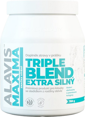 Alavis Maxima Triple Blend Extra je kombinovaný živočíšny a vitamínový výživový doplnok v prášku, obsahujúci 2 typy kolagénu - glukózamín a chondroitín sulfát obohatený o vitamín C, ktorý prispieva k normálnej tvorbe kolagénu a k prirodzenej funkcii chrupaviek a kostí.