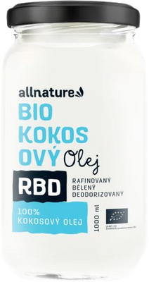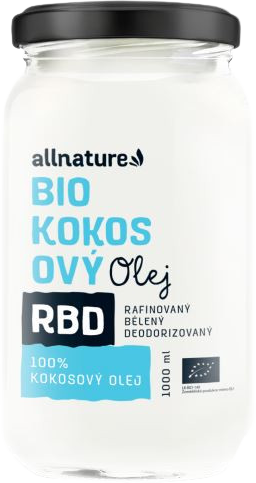 Allnature RBD BIO Kokosový olej - bez vône 1000 mlVšetko o produkteDoplňujúce informácieHodnotenie produktuRafinovaný kokosový olej je vhodný na varenie, pečenie, vyprážanie a všade tam, kde nie je žiaduca jeho kokosová chuť a vôňa. Jeho použitie je ideálne pri vyšších teplotách tepelného spracovania potravín, pretože dymový bod (bod prepálenia) tohto oleja je až 232 °C. Rafinovaný olej má neutrálnu vôňu a je možné ho tiež použiť ako kozmetický prípravok na pleť aj na celé telo.
