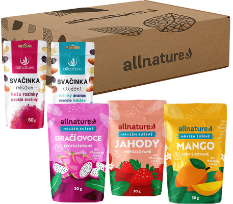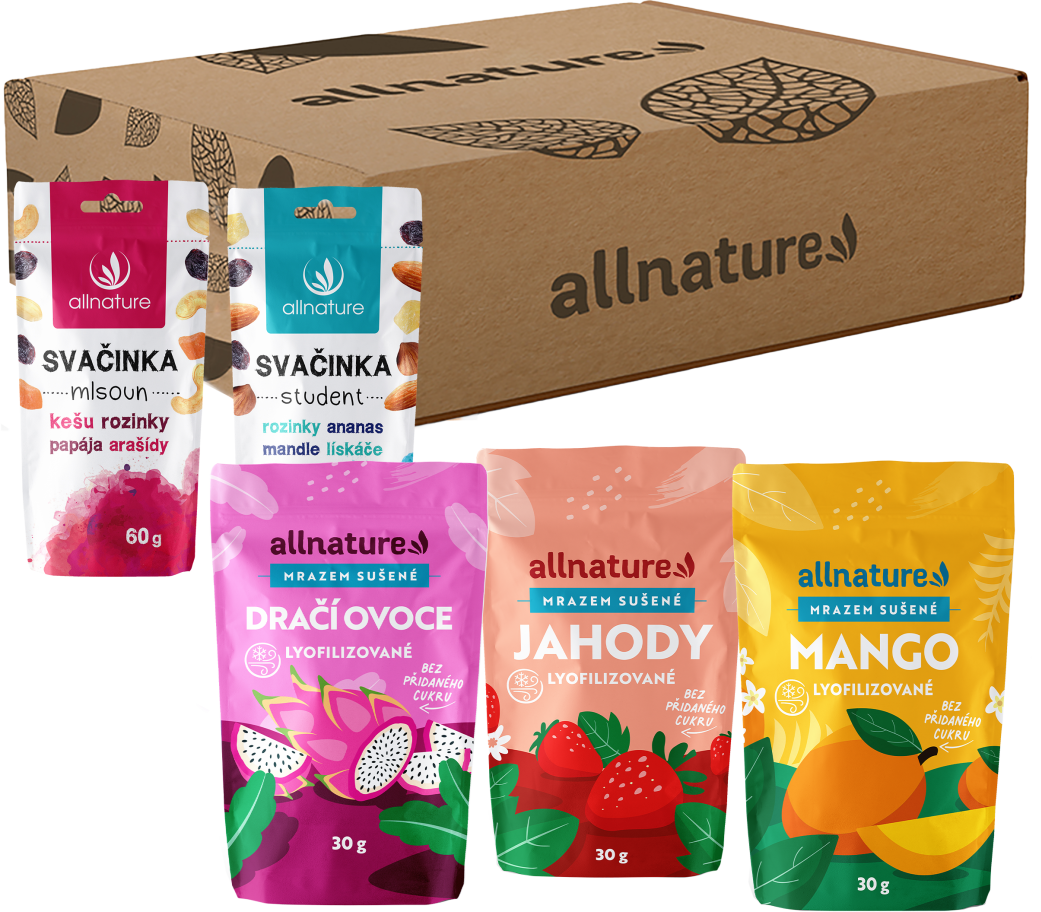 - Allnature Snack Mix Mlsoun 60 g – vyvážená zmes orechov a ovocia, ktorá poteší každého milovníka zdravého občerstvenia