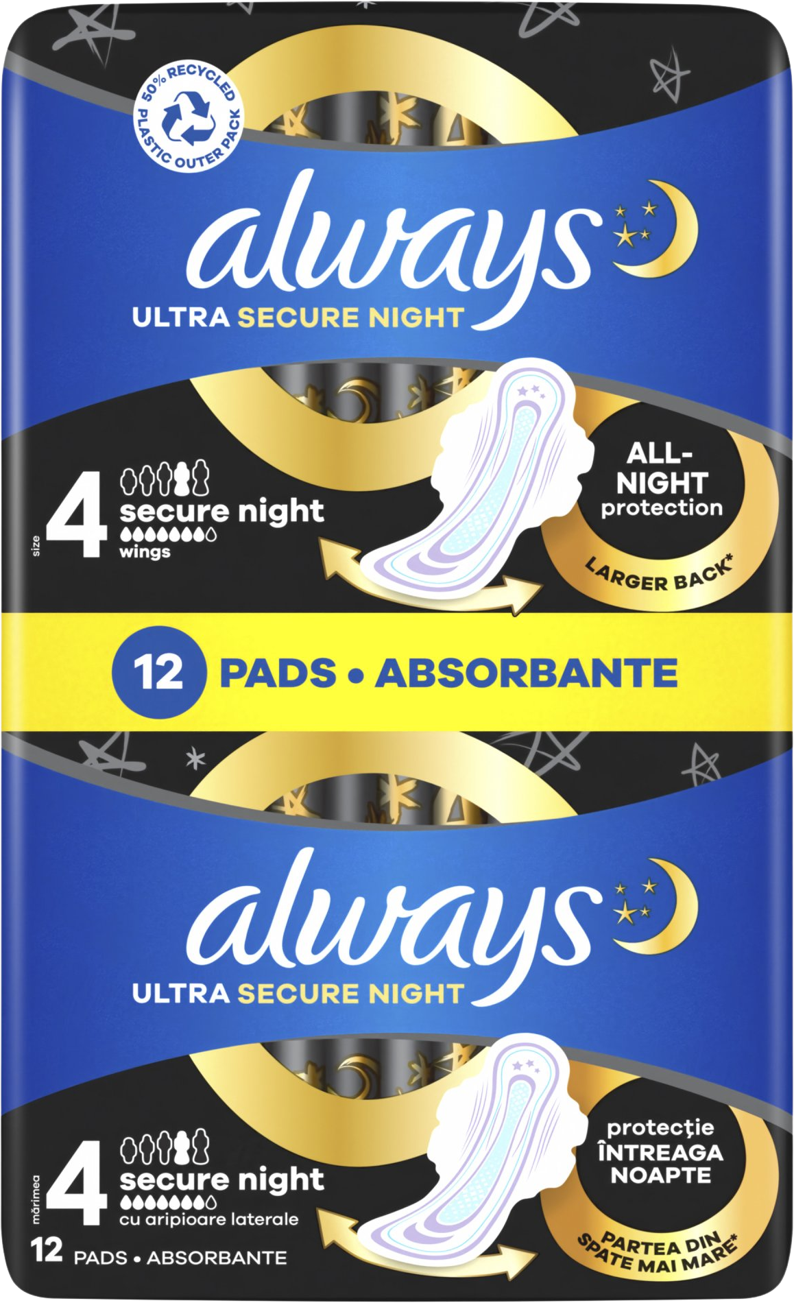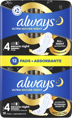 Doprajte si pokojný spánok, Always Ultra s trojnásobnou ochranou sa o vás postará. Dermatologicky schválila Aliancia pre zdravie pokožky (Skin Health Alliance). Pre extra ochranu vyskúšajte hygienické vložky Always Ultra Secure Night Extra (veľkosť 5), ktoré sú najlepšie z radu Always na použitie v noci. Vďaka systému na určenie vhodnej veľkosti Always Moja Veľkosť si nájdete tú najlepšiu ochranu od ALWAYS podľa intenzity svojej menštruácie a veľkosti spodných nohavičiek.