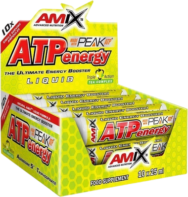 Amix ATP Energy je doplnok stravy vo forme shotov s citrónovou príchuťou. Prípravok pôsobí na zvýšenie hladiny ATP (základný zdroj energie na bunkovej úrovni), ideálny pre všetky silovo vytrvalostné a rýchlostne vytrvalostné športy. Podporuje využitie kyslíka pri záťaži a celkovej výkonnosti. Obsahuje taurín, kofeín, komplex čajových extraktov (extrakt z čierneho, bieleho a zeleného čaju) a ďalšie zložky.
