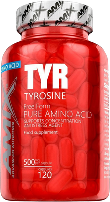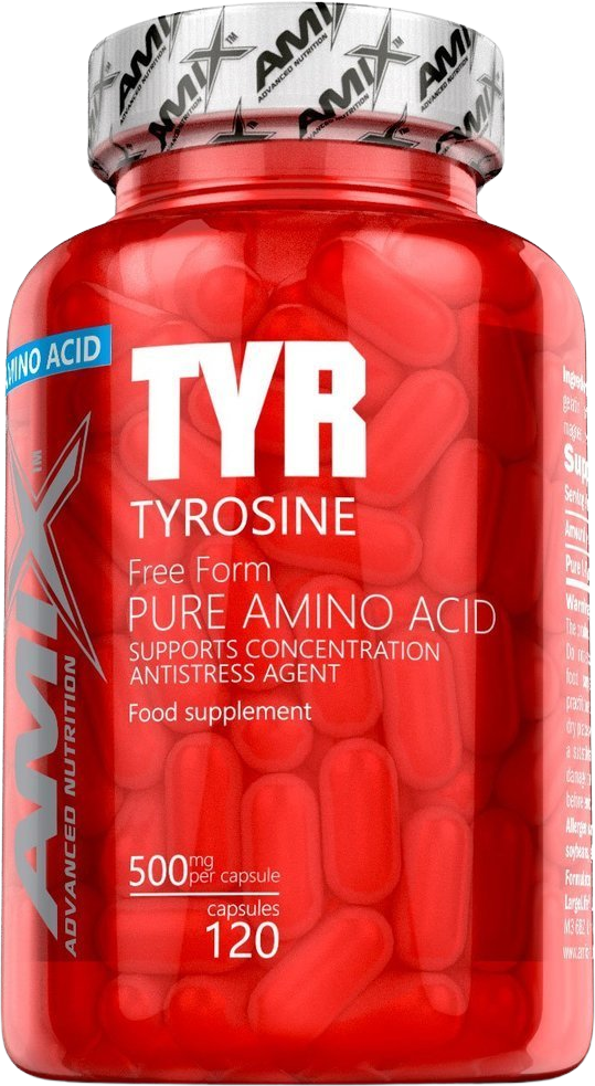 Kapsuly s obsahom aminokyseliny L-Tyrozín.Amix L-Tyrosine je neesenciálna aminokyselina, ktorá v tele podporuje tvorbu hormónu adrenalín. Tým výrazne stimuluje činnosť kardiovaskulárneho systému, podporuje spaľovanie tukov a navyše zvyšuje výkon pri zaťažovacích (športových) činnostiach. Pozitívne ovplyvňuje tiež centrálny nervový systém a to podporou tvorby endorfínu, čím zlepšuje náladu a motiváciu pre cvičenie. Maximálna odporúčaná dávka je 1500 mg L-Tyrozínu (tj. 3 kapsule) denne.