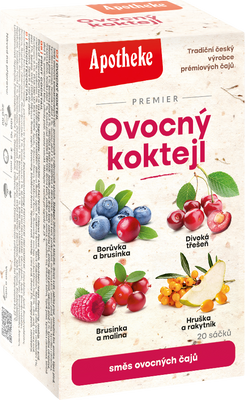 Apotheke Premier, ovocný koktail zmes čajov 5 x 4 vrecúšokVšetko o produkteDoplňujúce informácieHodnotenie produktuApotheke Tea Fruit Cocktail 4v1 obsahuje 4 druhy lahodných ovocných čajov, ktoré môžete piť horúce alebo studené na osvieženie.