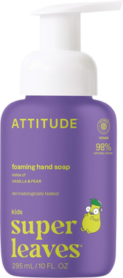 Attitude Detské penivé mydlo na ruky Little leaves s vôňou vanilky a hrušky 295 mlVšetko o produkteDoplňujúce informácieHodnotenie produktuMydlo na ruky ATTITUDE je obohatené o výťažky z listov čučoriedok a semien moringy.