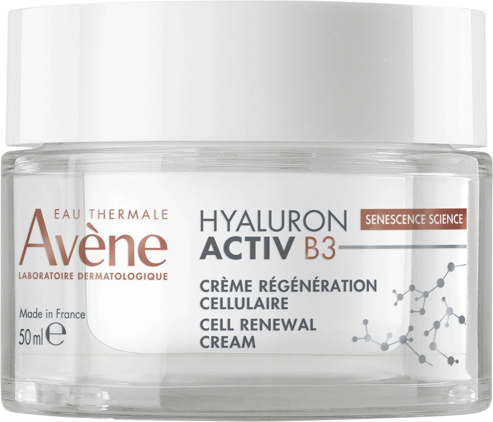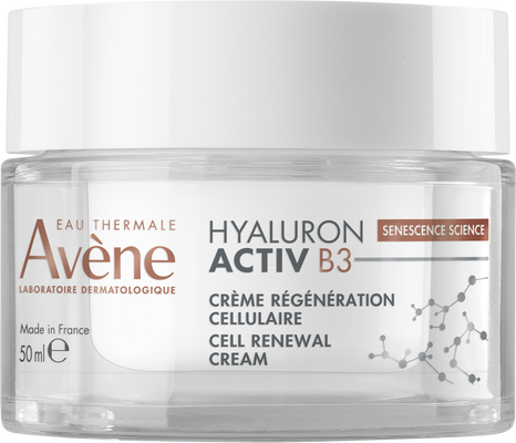 S vekom starnúce bunky pribúdajú rýchlejšie. Dermatologické laboratóriá Avène vytvorili Hyaluron Activ B3 krém s čistou kyselinou hyalurónovou v koncentrácii 0,2% (s vysokou a nízkou molekulárnou hmotnosťou) a 6% niacínamidom, ktoré spoločne pôsobia na príčinu starnutia a predlžujú životnosť buniek*. Pleť je už po prvej aplikácii vypnutá, vyhladená a žiarivá. Po 2 týždňoch je pleť regenerovaná, pevnejšia a vrásky sú redukované**.