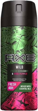 Axe deo sprej Wild Fresh Bergamot & Pink Pepper 150 mlVšetko o produkteDoplňujúce informácieHodnotenie produktuKombinácia elegantnej a uvoľňujúcej drevitej vône s divokým citrusovým nádychom bergamotu a ružového korenia poskytujú až 48-hodinovú sviežosť. AXE Wild je inšpirovaný prírodou, obohatený o esenciálne oleje a bez obsahu alumíniových solí. Otočte uzáver a aplikujte na telo a krk pre úplne nový divoký zážitok!