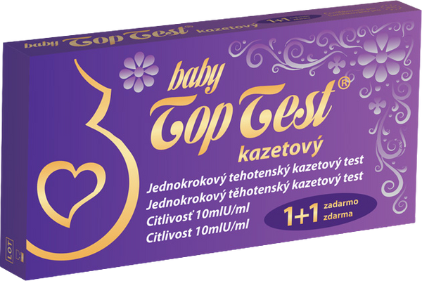 Tehotenský test Top Test baby je vysoko spoľahlivý a ľahko použiteľný jednokrokový kazetový test. Vďaka mimoriadnej citlivosti 10 mlU/ml dokáže rozpoznať prípadnú graviditu s vysokou presnosťou. Výsledok testu sa zobrazí v priebehu 3 minút.