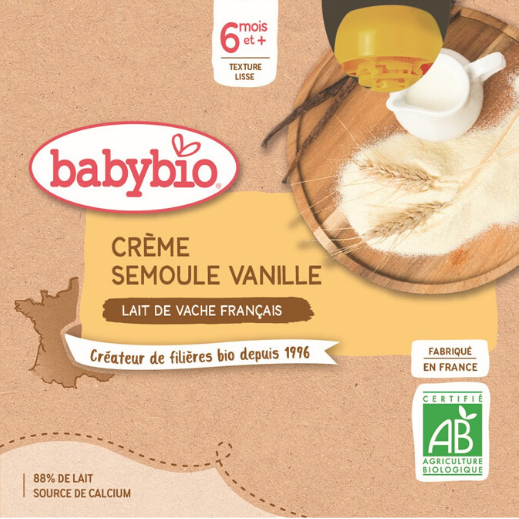 Od ukončeného 6. mesiaca. Krémový dezert s krupicou a vanilkou Babybio s veľmi jemnou textúrou je vyrábaný zo starostlivo vybraných bio zložiek bez zbytočných doplnkov. Je ponúkaný v obaloch doypack pre deti od ukončeného 6. mesiaca. Balenie vhodné aj na cesty, dieťa môže z doypack konzumovať dezert samostatne. Ak to ešte nezvládne, tak to ide na lyžičku za pomoci dospelého. Dezert je vhodné podávať po hlavnom jedle.