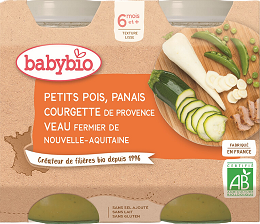 Babybio menu hrášok, paštrnák, cuketa s teľacím mäsom 2 x 200g. Od ukončeného 6. mesiaca, farmárske teľacie mäso, bez lepku. Viac informácií