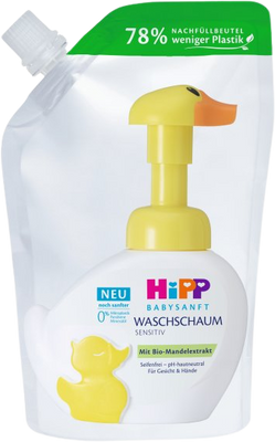 Pena na umývanie s cennými zložkami z BIO mandlí umýva citlivú pokožku tváre a rúk obzvlášť šetrne a chráni ju pred vysušením. Na každodennú hygienu, ktorá deti baví. Neštípe v očiach. REFILL sáčok má v porovnaní s HiPP Kačkou o 78 % menej plastov. Viac informácií