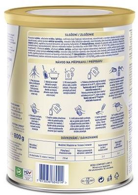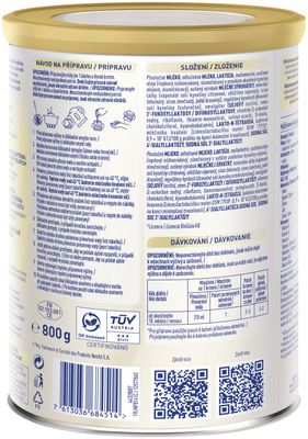 Plnotučné MLIEKO, odtučnené MLIEKO, LAKTÓZA, maltodextrín, rastlinné oleje (repkový nízkoerukový, slnečnicový s vysokým obsahom kyseliny olejovej, slnečnicový), sušený výrobok MLIEČNE SUROVATKY, minerálne látky (vápenaté soli kyselina citrónová, u d draselný ), regulátory kyslosti (draselné soli kyseliny fosforečnej), emulgátor (SÓJOVÝ lecitín), vitamíny (L-askorbát sodný, riboflavín, tiamín-mononitrát, retinyl-acetát, D-biotín, cholekalciferol, kyanokobala kvasenie (Limosilactobacillus reuteri DSM 17938; 8,9 × 107 KTJ/100 g prášku na konci minimálnej trvanlivosti).