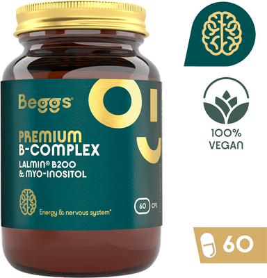 Beggs Premium B-Complex je výživový doplnok na každodennú podporu organizmu. Kombinuje myo-inositol a Lalmin® B200 – inaktivované kvasnice obohatené o všetky základné vitamíny skupiny B.