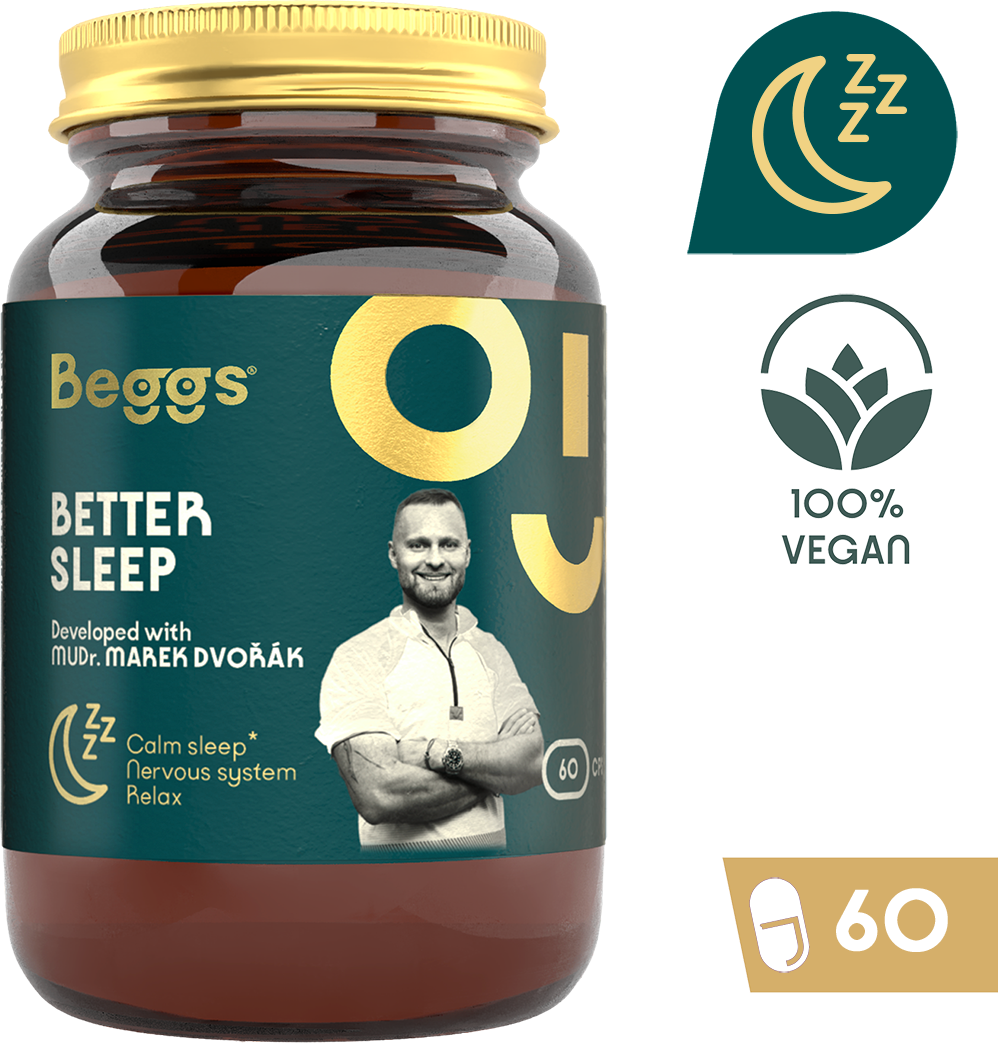 Beggs Better Sleep je doplnok stravy na večerný režim a na podporu vášho denného režimu. Obsahuje starostlivo vybranú kombináciu bylinných extraktov, valeriány, chmeľu otáčavého a mučenky, doplnenú o GABA a vitamín B6. Vitamín B6 prispieva k normálnej činnosti nervovej sústavy a k normálnej psychickej činnosti.
