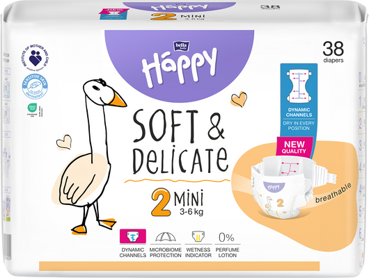 Bella Baby Happy Soft&Delicate Mini (3-6 kg), 38 ksVšetko o produkteDoplňujúce informácieHodnotenie produktuDetské plienky Bella Baby Happy s kanálikmi Soft & Delicate 2 Mini (3–6 kg) sú navrhnuté tak, aby poskytovali maximálne pohodlie a ochranu citlivej detskej pokožky. Vďaka novej technológii kanálikov dochádza k rýchlemu rozloženiu tekutín, čo zaisťuje rýchlejšiu absorpciu a väčší pocit sucha. Certifikát Dermatest Sensitive Skin potvrdzuje vysokú kvalitu a bezpečnosť plienky. Vďaka extra priedušnému absorpčnému jadru udržujú pokožku suchú a chránenú pred podráždením a zapareninami.