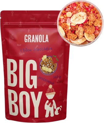 Big Boy Proteínová granola s bielou čokoládou a ovocím 360 gVšetko o produkteDoplňujúce informácieHodnotenie produktuBig Boy sa spojili s influencerkou Kamilou Šiklovou a pomenili křupavé a voňavé granoly plné čokolády, orechov a lyo ovocia. Vyber si granolu podľa svojich chutí a krásne ráno môže začať. Okamžitá závislosť zaručená!