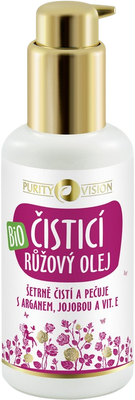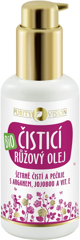 Bio Ružový čistiaci olej PURITY VISION obsahuje jedinečnú kombináciu Bio Ružovej vody a za studena lisovaných Bio olejov, ktorá pleť hĺbkovo vyčistí, upokojí a hydratuje. Olej z pleti odstráni nadbytočný kožný maz, odumreté bunky aj vonkajšie nečistoty. Vďaka synergii ďalších 100% prírodných olejov ako je Bio Mandľový, Bio Hroznový, Bio Arganový, Bio Ricínový olej či Bio Jojobový olej pokožku taktiež vyživuje a vyhladzuje.