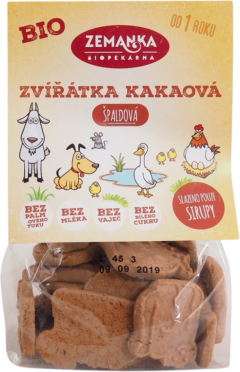 Biopekáreň Zemanka špaldové bio kakaové zvieratká zachutnajú všetkým malým členom rodiny. Špaldové bio kakaové zvieratká sú pečené bez použitia palmového tuku a na ich sladenie nebol použitý repný ani trstinový cukor, ale prírodný ryžový a agávový sirup.