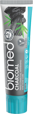 Zubná pasta BIOMED CHARCOAL je určená pre dospelých a deti od 6 rokov a obsahuje 98 % zložiek prírodného pôvodu. Obsahuje tri typy uhlia (bambusové, aktívne a drevené), ktoré v kombinácii s enzýmom bromelainom z ananásového extraktu jemne čistia zuby od zafarbeného povlaku. Prírodné antiseptiká vo forme výťažkov zo skorocelu a brezových listov majú pozitívny vplyv na stav ďasien a upokojujú ich.