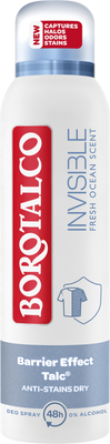 Borotalco Invisible Deodorant Spray Fresh je dezodorant proti škvrnám určený na redukciu krúžkov a škvŕn na oblečení. Účinný na biele a žlté škvrny, dokonca aj na jemných tkaninách, ako sú hodvábne odevy. Sprej Borotalco absorbuje pot a zanecháva pokožku podpazušia suchú a chránenú po celých 48 hodín vďaka účinnému zloženiu bez alkoholu. Viac informácií