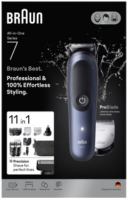 Dosiahnite presné zastrihnutie alebo oholenie akéhokoľvek štýlu fúzov vďaka extrémne ostrým nožom ProBlade a technológii AutoSense. Dosiahnite dôkladné oholenie a dokonalé línie s hlavou PrecisionShave. 14 nastavení dĺžky a rukoväť AquaGrip na použitie pod vodou vám poskytujú plnú kontrolu pri úprave. Strojček AIO Series 7 je skonštruovaný tak, aby vydržal, je vodotesný a má lítium-iónovú batériu s výdržou až 120 minút prevádzky.
