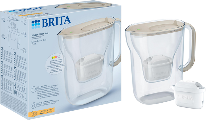 Piesková filtračná kanvica Brita Style Essential je vyrobená zo 60 % z biologického materiálu. Moderný dizajn s vekom, ktoré sa dá otvoriť jednou rukou a ľahko naplniť. Kanvicu možno umývať v umývačke riadu (s výnimkou Smart light). Ideálna na dvere chladničky. Objem 2,4 l, 1,4 l filtrovanej vody. LED indikátor vám včas pripomenie výmenu filtra. Balenie obsahuje 1ks filtra Brita Maxtra Hard Water Expert na optimálnu filtráciu a veľmi tvrdú vodu. Spoľahlivá filtrácia Brita Perfect Fit pri použití filtrov Brita MAxtra+ alebo Maxtra Pro.