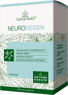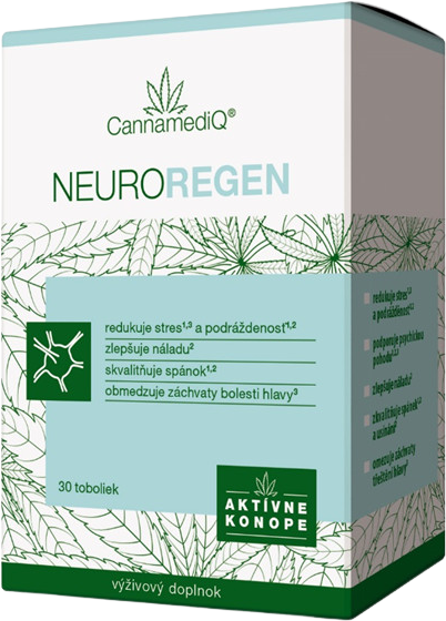 CannamediQ Neuroregen – výživový doplnok modulujúci nervové potiaže1,2,3 v troch smeroch. Unikátna kombinácia L-tryptofanu, valeriány1, medovky2, bakopy3 a konopného extraktu podporuje psychickú pohodu1,2,3, redukuje stres1,3 i podráždenie1,2, zlepšuje kvalitu spánku1,2 a zaspávanie2. Bakopa naviac podporuje prokrvenie mozgu3 a zmierňuje stres3, čím efektivne obmedzuje záchvaty treštenia hlavy3. Prírodné zloženie Neuroregenu na báze konope a rastlinných extraktov zaisťuje vysokú účinnosť a maximálnu bezpečnosť užívania bez vedľajších účinkov.