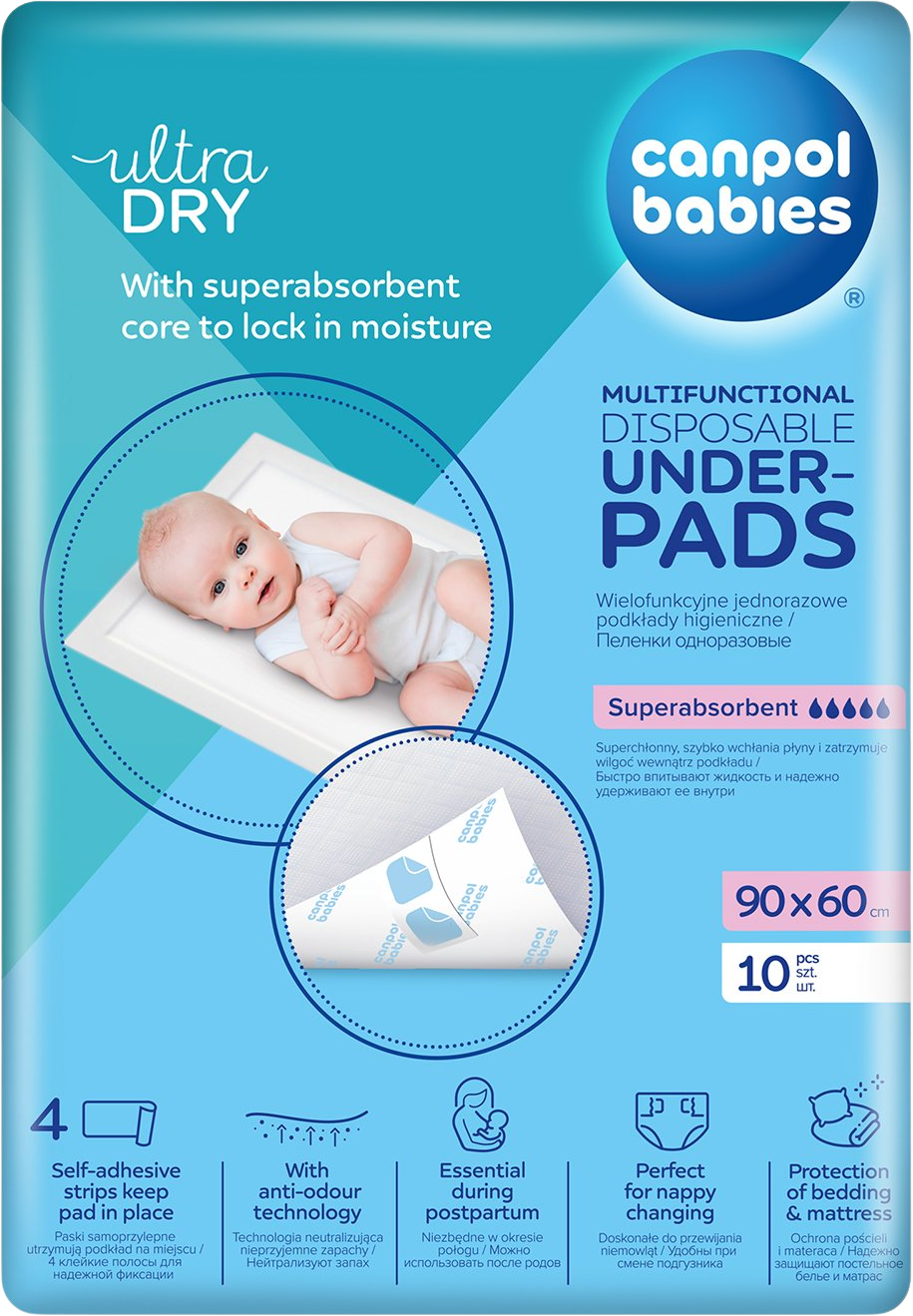 Canpol babies Multifunkčné hygienické podložky lepiace 90x60cm 10 ksVšetko o produkteDoplňujúce informácieHodnotenie produktuHygienické podložky sú pre ženy v popôrodnom období nevyhnutné, chránia posteľnú bielizeň a matrac pred znečistením. Vďaka 4 lepiacim pásikom držia vložku na svojom mieste – nehýbu sa ani nerolujú, čím zvyšujú komfort mamičky. Podložky sú perfektné pri prebaľovaní bábätka, pri cestovaní, pri návšteve ambulancie alebo ako ochrana matraca (pretekajúca plienka, odgrgnutie a pod.) a pri učení sa chodiť na nočník.