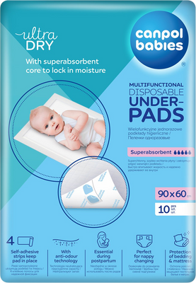 Multifunkčné hygienické podložky Canpol babies s vodeodolnou ochrannou vrstvou na spodnej strane podložky sú ideálne pre mnohé situácie. Superabsorpčná podložka rýchlo absorbuje tekutiny a zadržiava vlhkosť vo vnútri podložky. Viac informácií