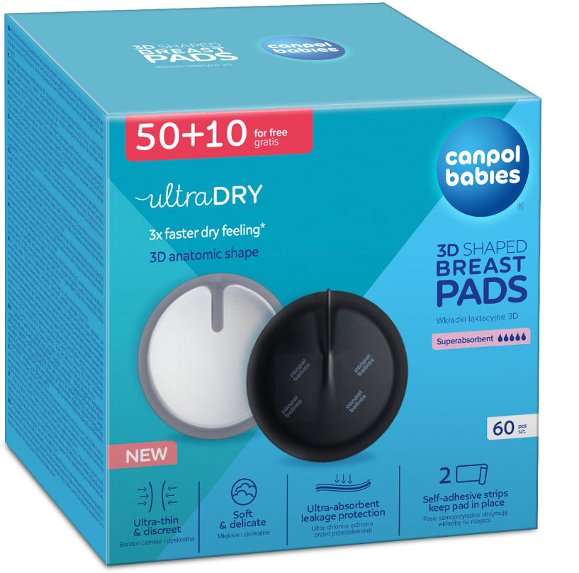 Dojčenské jednorazové vložky do podprsenky Canpol babies sú určené pre ženy v neskorších štádiách tehotenstva a dojčiace matky. Nedráždia citlivú pokožku prsníkov ani bradavky. Mäkká absorpčná vrstva zabraňuje úniku mlieka a nepriepustná vonkajšia vrstva zabraňuje znečisteniu spodnej bielizne. Samolepiaca páska pomáha fixovať vložku na správnom mieste. Vložky sa dokonale prispôsobia tvaru prsníka a ich použitie je veľmi diskrétne. Dodávajú sa v balení po 60 kusov.