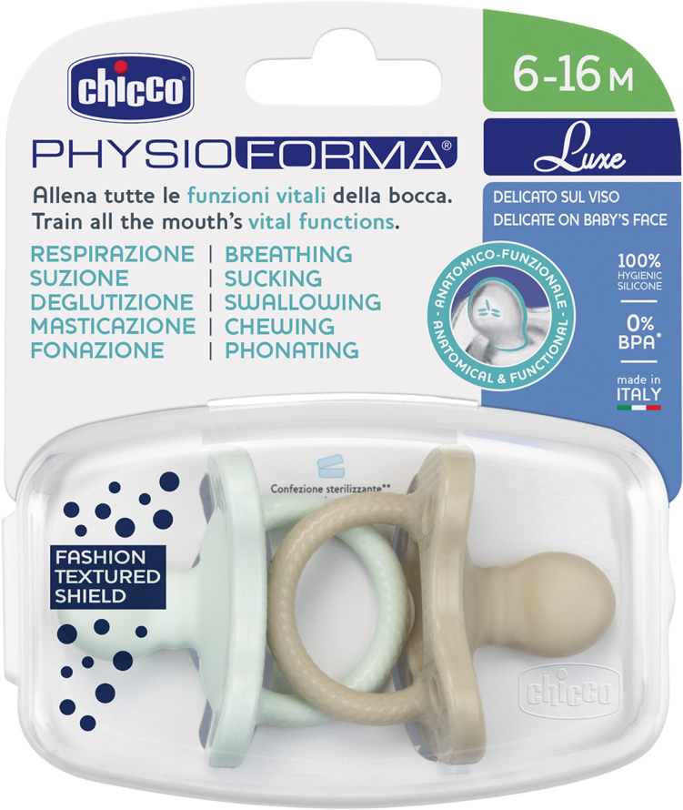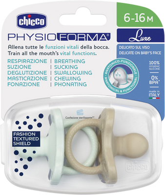 Cumlík Chicco Physio Luxe z radu Physioforma patrí medzi aktívne ortodontické cumlíky. Štít cumlíka bol špeciálne navrhnutý tak, aby poskytoval maximálne pohodlie pri čo najmenšej kontaktnej ploche s tvárou dieťaťa, a to aj pre tú najcitlivejšiu pokožku so sklonom k podráždeniu. Viac informácií