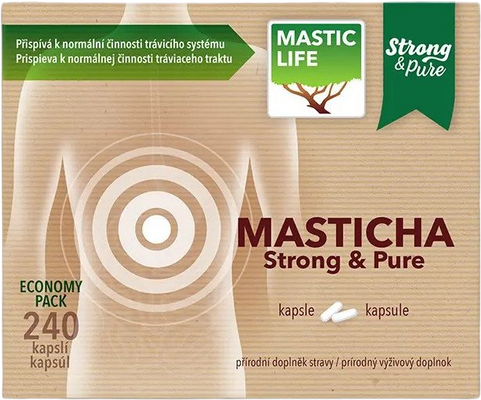 Masticlife Čistý prášok z chioskej Mastichy 240 kapsúlVšetko o produkteDoplňujúce informácieHodnotenie produktuČistý prášok z chioskej mastichy bez prísad pre normálnu činnosť tráviaceho traktu. Každá kapsula je samostatne balená v blistri a chránená pred kontamináciou až do okamihu použitia. Masticlife Strong&Pure kapsule obsahujú optimálne množstvo prášku (350 mg) s ohľadom na odporúčané dávkovanie a pohodlné užívanie. Je použitá kapsula podľa vegánskych štandardov.