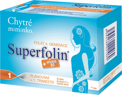 Chytré miminko Superfolin 1 Plan 30 tablietVšetko o produkteDoplňujúce informácieHodnotenie produktuDoplnok stravy s vysokým obsahom kyseliny listovej. Zodpovedá najnovším poznatkom o správnom vývoji vášho dieťaťa, vrátane aktualizovaných Odporúčaných postupov českých gynekologických odborných spoločností o kyseline listovej, prijatých v máji 2013. Jej vysoký obsah kyseliny listovej (ktorý je v súlade s dnešnými názormi na výživu v tehotenstve) presahuje súčasné normy bežné na českom trhu. Vďaka obsahu kyseliny listovej Quatrefolic® – štvrtej generácie (prvý výrobok v Európe s týmto najmodernejším zložením) je tento výrobok vynikajúci aj pre slabé metabolizéry klasickej kyseliny listovej.