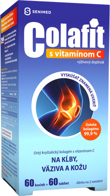 Colafit je čistý kryštalický kolagén, čistoty 99,9%, ktorý má veľmi priaznivý vplyv na pokožky. Obsiahnutý vitamín C navyše prispieva k tvorbe kolagénu pre normálnu funkciu chrupaviek, kostí, zubov a ďasien. Balenie: 60x Colafit kocky a 60x tabletky s vitamínom C. Viac informácií