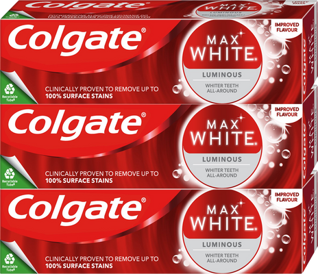 Colgate Max White Luminous Zubná pasta 3 x 75 mlVšetko o produkteDoplňujúce informácieHodnotenie produktuPoistite si zdravý chrup zubnou pastou Colgate Max White One Luminous. Žiarivo biele zuby si zaobstaráte okamžite. Pasta Colgate One Luminous obsahuje unikátnu novinku smart foam.