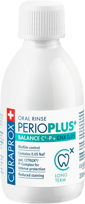 Ústna voda CURAPROX Perio Plus Balance s 0,05 % chlórhexidínu (CHX), citroxom a fluoridom sodným. Viac informácií