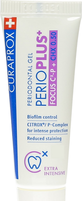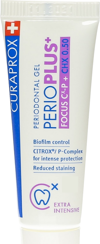 Zubný gél CURAPROX Perio Plus Focus s 0,5 % chlórhexidínu, citroxom a kyselinou hyalurónovou. Viac informácií