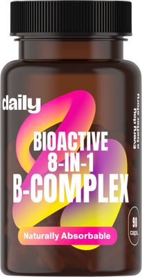 Bioactive 8-in-1 B-Vitamins Complex od Daily je vytvorený tak, aby telu dodal presne to, čo potrebuje – bez nadbytku, ktorý by zaťažoval organizmus. Každá kapsula obsahuje všetkých osem základných vitamínov skupiny B vo formách, ktoré môže telo okamžite využiť – vrátane P-5-P (aktívny B6) a metylkobalamínu (aktívny B12).