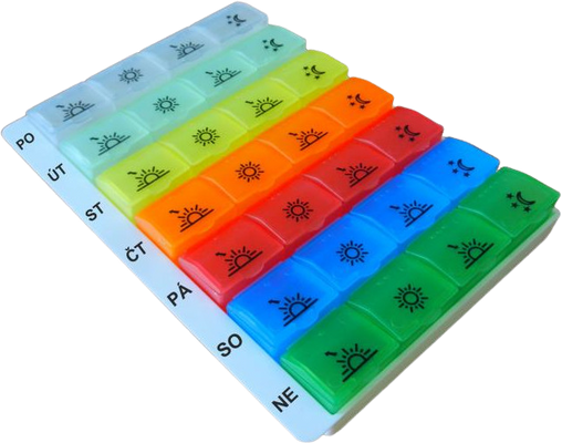 Obzor Dávkovač liekov typ 04 týždenný dúhovýVšetko o produkteDoplňujúce informácieHodnotenie produktuUmožňuje uloženie väčšieho počtu liekov alebo potravinových doplnkov do samostatne otvárateľných priehradiek.