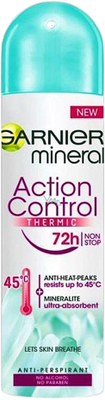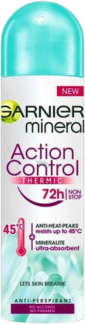 Garnier Antiperspirant v spreji Garnier Mineral Action Control Thermic 72h 150 mlVšetko o produkteDoplňujúce informácieHodnotenie produktuGarnier Mineral Action Control Thermic 72h je antiperspirant pre maximálnu, až 72h účinnosť pri vysokých teplotách.