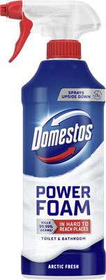 Domestos Power Foam Arctic Fresh Spray je čistiaci prostriedok na toalety a kúpeľne, ktorý ničí baktérie* na najťažšie dostupných miestach (*baktérie a obalené vírusy, ako je vakcína).
