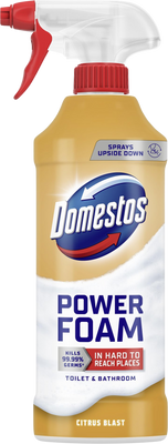 Domestos Power Foam Citrus Blast Spray je čistiaci prostriedok na toalety a kúpeľne, ktorý ničí baktérie* na najťažšie dostupných miestach (*baktérie a obalené vírusy, ako je vakcína).
