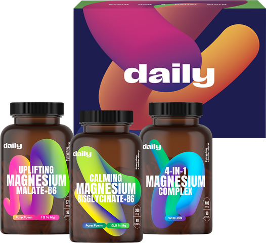 Objavte silu vyváženej kombinácie horčíka v rôznych formách na podporu vašej energie, vitality a duševnej pohody. Tento balíček kombinuje tri prémiové doplnky stravy Daily určené na komplexnú starostlivosť o telo a myseľ. Spoločne tvoria ideálny balík pre každého, kto hľadá spoľahlivú podporu pri náročnom životnom štýle, športe alebo každodennom strese.