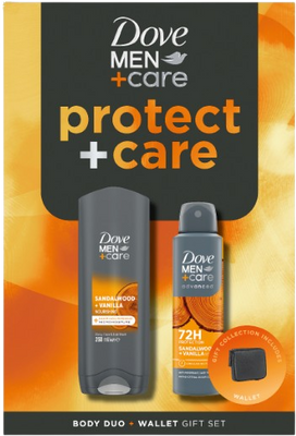 Dove Men + care darčeková sada telovej starostlivosti Sandalwood and VanillaVšetko o produkteDoplňujúce informácieHodnotenie produktuDove Men+Care Advanced deodorant ve spreji pro santalové dřevo a wanillu, který vás ochrání před potem až po dobu 72 hodin, hydratuje pokožku v podpaží a zajistí pocit čistoty po celý den. Stylová pánská peněženka s kompaktním a praktickým designem, která dodává sadě další styl a praktičnost. Tato pečlivě zabalená sada je ideální volbou pro osobitý dárek – ať už ji obdarováváte milovanou osobu, nebo si ji vybíráte pro sebe. Objednejte si nyní a nabídněte okamžik prvotřídní péče se spolehlivou vůní a doplňky, které inspirují styl.
