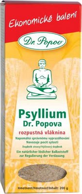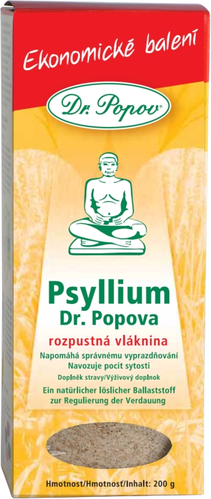 Psyllium Dr. Popova zvyšuje dennú spotrebu vlákniny, zmäkčuje stolicu, zväčšuje jej objem, a tým napomáha správnemu a ľahkému vyprázdňovaniu - dôležité pri zápche, hemoroidoch, v tehotenstve a pod. Pri konzumácii nalačno Psyllium Dr. Popova navodzuje pocit nasýtenia – vhodné pri redukčných diétach. Obsahuje rozpustnú vlákninu, ktorá podporuje správny metabolizmus tukov a napomáha tiež udržovať správnu hladinu cholesterolu. Výrobok je doplnkom stravy. Viac informácií