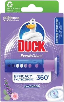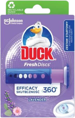 WC cleaner Duck Fresh Discs s vôňou levandule je alternatívou ku klasickým WC blokom. Náplň 5 v 1 aktívne bojuje proti usadeninám vodného kameňa a poskytuje dlhotrvajúcu sviežosť. Účinok sa dostaví pri každom spláchnutí, je dlhotrvajúci a vydrží až 8 týždňov. Oceníte aj hygienický spôsob aplikácie. Duck Fresh Discs Levanduľový gélový disk udržuje vašu toaletu sviežu a čistú.
