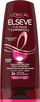L'Oréal Paris Elseve Elseve Full Resist balzam 200 mlVšetko o produkteDoplňujúce informácieHodnotenie produktuStres, sezónne zmeny, česanie a styling… to všetko ovplyvňuje pocit oslabených, tenších vlasov, ktoré majú tendenciu skončiť na vašom hrebeni. Trénujte odolnosť vašich vlasov s posilňujúcim radom Full Resist pre slabé vlasy s tendenciou vypadávať. Uľahčite ich rozčesávanie a ochráňte ich pred každodenným vypadávaním a lámavosťou vďaka nášmu posilňujúcemu balzamu obohatenému o Aminexil a ďalšie aktívne zložky Biotin + Arginin.